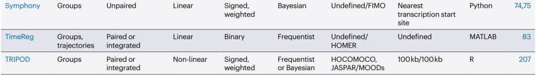 频率回归:大多数方法旨在通过频率回归在不同组(通常是细胞类型)之间建模 GRNs。例如FigR和GRaNIE使用线性回归,DIRECT-NET和SCENIC+使用非线性回归(如随机森林),PECA和Symphony则采用贝叶斯建模。CellOracle、Inferelator 3.0 和 Pando 为用户提供了多种建模策略。