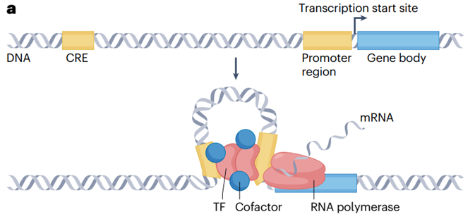 DNA 可及性的改变可以通过所谓的先锋 TFs 的结合触发。其他 TFs 可以结合到 DNA 的远端顺式调控元件(cis-regulatory elements,CREs)上,并与辅助因子和其他蛋白质合作,共同使 RNA 聚合酶复合物聚集和稳定下来,从而发生转录(mRNA)。