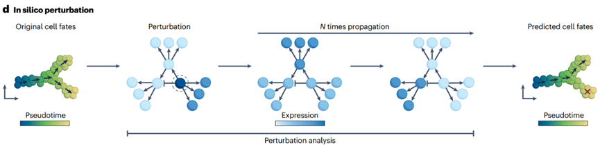 GRNs 可以通过迭代方式将 TF 表达传播到目标基因,来模拟基因表达值随时间的变化。在这个框架下,可以通过改变候选 TF 的表达来进行计算机内的扰动,然后观察在给定迭代次数后它如何影响生成的转录组。之后,可以将模拟值与局部邻近细胞的基因表达相比较,以估计细胞身份转变概率,类似于 RNA 速率分析。