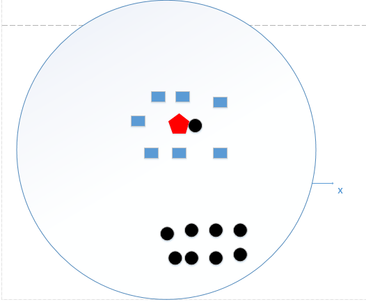 上图中有俩类,一个是黑色的圆点,一个是蓝色的长方形,现在我们的待分类点是红色的五边形。