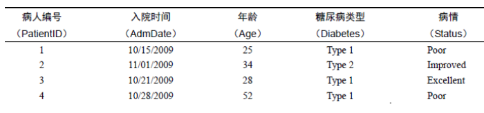 数据集通常是由不同类型的数据构成的一个矩形格式,每一行表示一个观测(observation),每一列表示一个变量(variable),我们用的最多的数据集是表格型(tabular)的结构,下表是一个医学中常见的病例数据集演示:
