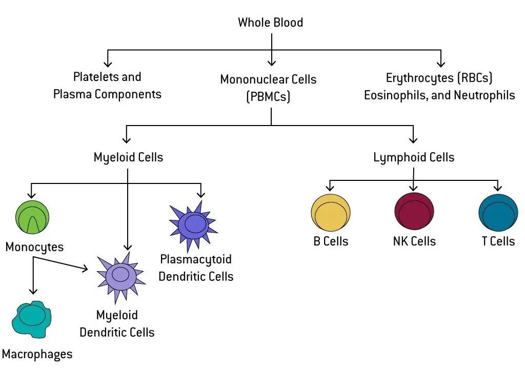 从原理上将,单个核细胞的体积、形态和比重与外周血其它细胞不同,红细胞和多核白细胞的比重超过1.080,单个核细胞的比重为1.070左右,血小板为1.030左右。因此,利用各种血细胞和单个核细胞比重之间的差异可以将各种血细胞与单个核细胞分离开来。