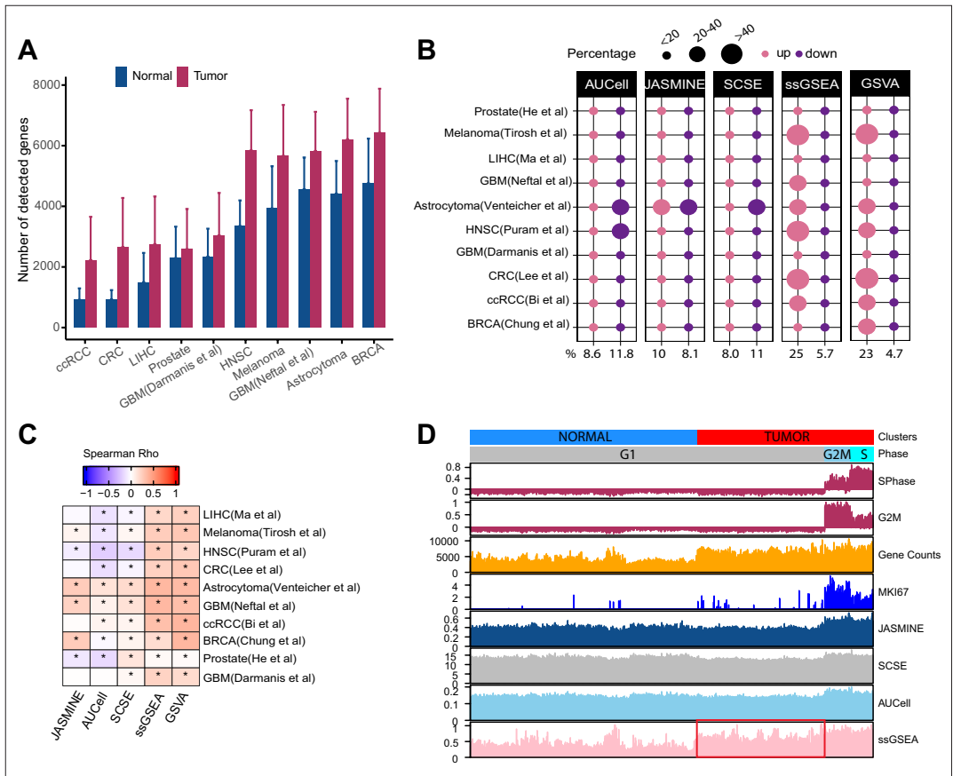 全面的基准测试:论文对五种签名评分方法进行了全面的基准测试,包括单样本基因集富集分析(ssGSEA)、基因集变异分析(GSVA)、AUCell、单细胞签名探索器(SCSE)和一种新方法——联合评估签名均值和推断富集(JASMINE)。
